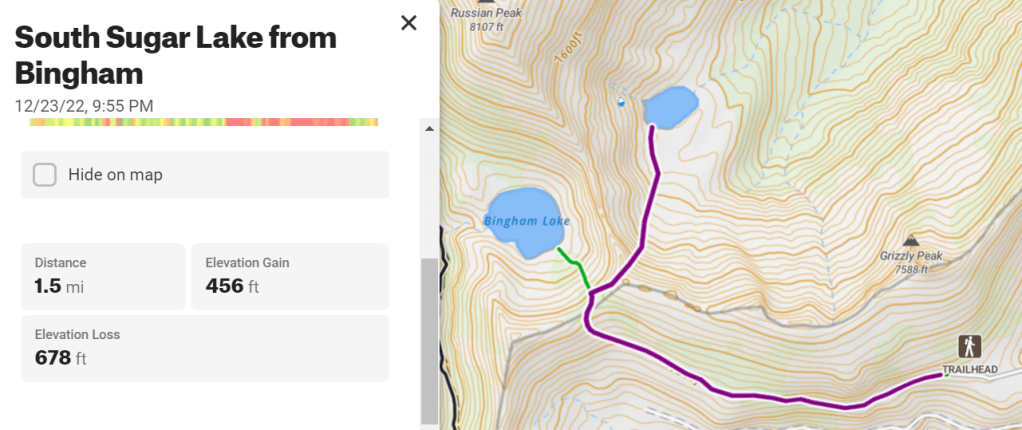 - South Sugar Lake from Bingham Trail pass = 1.5 miles